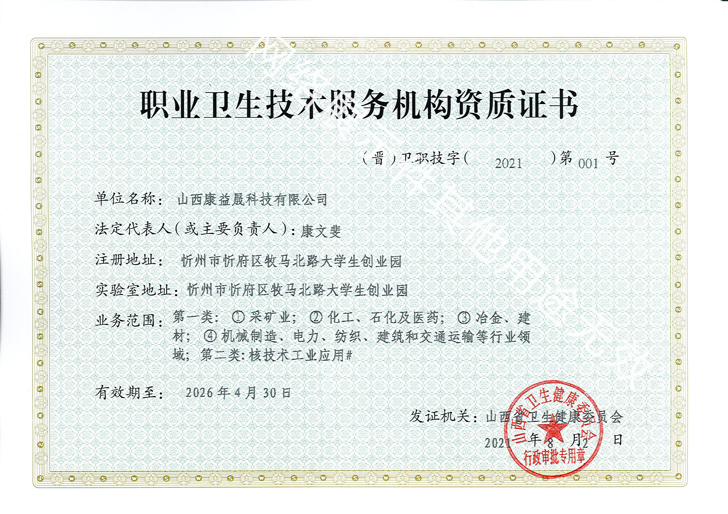 山西康益晟科技有限公司成立于2008年10月,原名為忻州市康益職業(yè)衛(wèi)生技術(shù)服務(wù)有限公司,地址位于忻州市忻府區(qū)牧馬北路大學(xué)生創(chuàng)業(yè)園,公司注冊(cè)資金600萬(wàn)元。系山西省安全生產(chǎn)監(jiān)督管理局批準(zhǔn)具有職業(yè)病危害因素檢測(cè)與評(píng)價(jià)乙級(jí)資質(zhì)((晉)安職技字(2014)第B-0003號(hào))的機(jī)構(gòu);我公司是山西省認(rèn)證認(rèn)可協(xié)會(huì)理事單位、中國(guó)職業(yè)安全健康協(xié)會(huì)職業(yè)衛(wèi)生技術(shù)服務(wù)分會(huì)會(huì)員、山西省安全生產(chǎn)協(xié)會(huì)安全評(píng)價(jià)及職業(yè)衛(wèi)生技術(shù)服務(wù)機(jī)構(gòu)會(huì)員單位、大學(xué)生就業(yè)培訓(xùn)基地2018年6月被評(píng)為科技中小型企業(yè),入庫(kù)編號(hào)為201814090200001335。